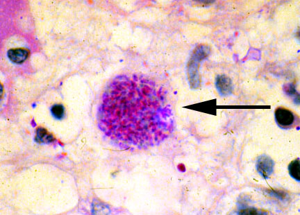 Toxoplasma gondii tissue cyst (arrow), PAS stain. Each cyst contains 50-5000 bradyzoites, which replicate following cyst rupture, unless destroyed by cellular immunity (the usual case). Cause of cyst rupture is unknown, but may be related to status of the immune response in the host. Some cysts rupture from time to time in normal hosts, for unknown reasons, but the bradyzoites are quickly destroyed and a small glial scar forms.