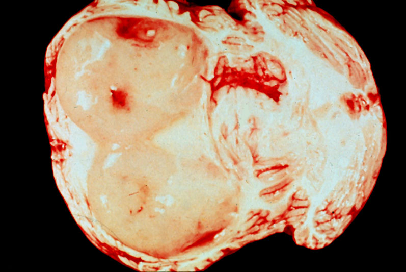 Cystic cerebellar astrocytoma with mural nodule from a 6 year old girl. This is a benign neoplasm and totally curable by resection, even if only the mural nodule is excised. Unfortunately, this child was not operated on and died of increased intracranial pressure in the posterior fossa and herniation of the cerebellar tonsils..