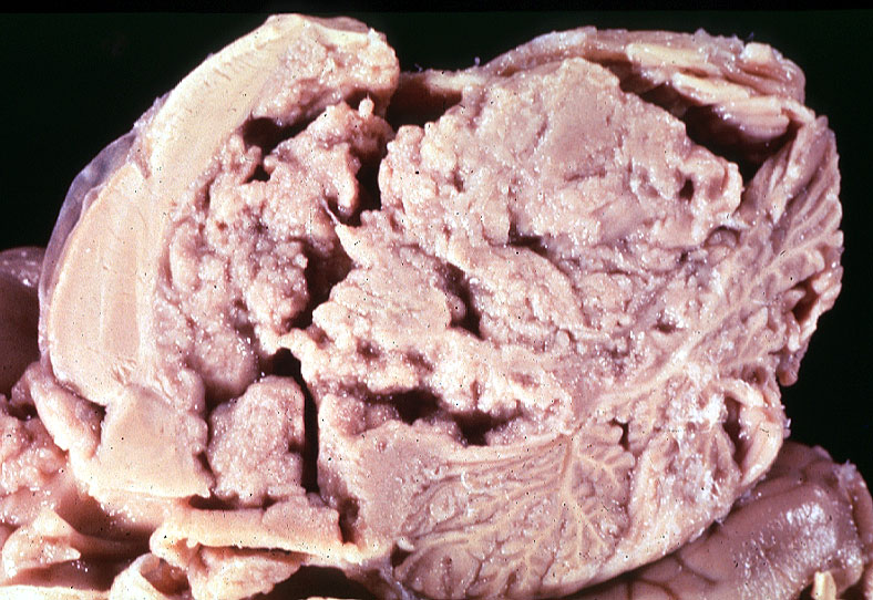 .The normal structure of the cerebellum is destroyed by the necrotic-appearing
