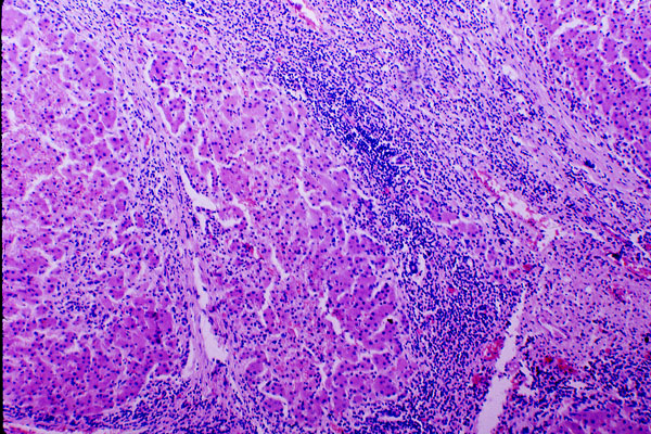 Numerous dark blue chronic inflammatory cells, mainly lymphocytes, can be seen within broad areas of fibrosis. Small islands of hepatocytes are gradually carved away from their neighbors by the process of "piecemeal necrosis". This process occurs over a period of many months, until end-stage liver disease is reached. Transplantation is one of the only options, but one risks infecting the new liver with the hepatitis virus. Interferon administration can sometimes help to clear the virus and stop the process of piecemeal necrosis.