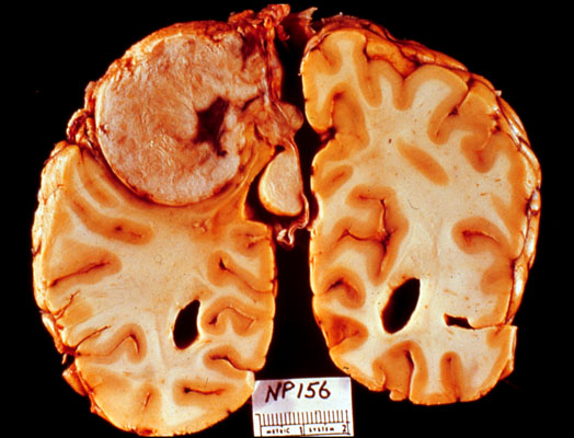 is well circumscribed and sharply demarcated from the compressed cerebral hemisphere.