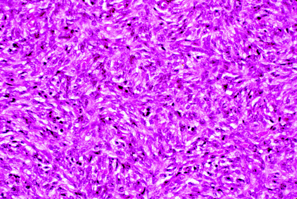 is highly cellular and consists of spindle-shaped cells arranged into intertwining bundles.