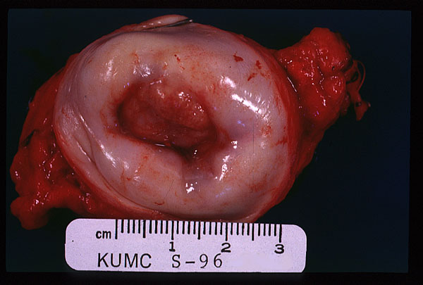 Squamous cell carcinoma of the uterine cervix, presenting as a polypoid growth at the external os. The vast majority of these lesions are thought to be induced by human papilloma virus (HPV) infection.