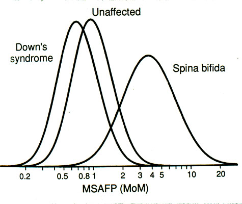 Elevated levels of alpha-fetoprotein (AFP) are present in maternal serum in the majority (approximately 80%) of open neural tube defects. A decreased level of AFP along with abnormal levels of hCG and estriol (triple test) in maternal serum is used as a screening test for Down syndrome. This screening test for Down syndrome detects up to 60% of cases of Down syndrome but has a high false positive rate.