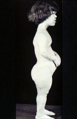 Achondroplasia, an autosomal dominant disorder that often occurs as a new mutation. Note small stature with short limbs, low nasal bridge, prominent forehead, lumbar lordosis. The head size is normal. (Figure 6-11 of Text).