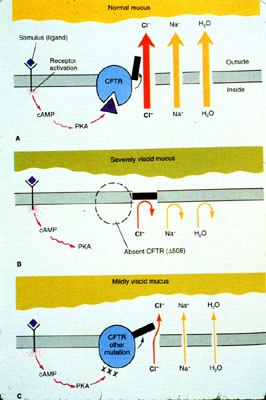 Molecular basis of decreased chloride secretion in mucus-producing epithelial cells. (A) In a normal person, the binding of an appropriate ligand to a surface receptor of a mucous cell, activates adenyl cyclase and elevates cAMP. cAMP then activates protein kinase A (PKA), which phosphorylates the cystic fibrosis transmembrane conductance regulator (CFTR). The activated CFTR is an open chloride channel in the plasma membrane. As a result, chloride ions are secreted into the extracellular mucus, which together with sodium ions and water, maintains the normal viscosity of mucus. In (B), persons with delF508 produce an incompletely glycosylaated mutant CFTR which is not transported to the plasma membrane, therefore stimulated Cl- secretion does not occur. As a consequence, the cell does not release Na+ and water, and the extracellular mucus is very viscid. In (C), patients with other mutations that produce a less severe CF, the mutant CFTR protein appears in the plasma membrane but is defective in response to cAMP. Cl- secretion is reduced but still present.