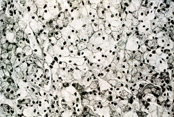 This slide depicts Niemann-Pick disease in the bone marrow. The marrow space is filled with fairly regular lipid-filled macrophages.