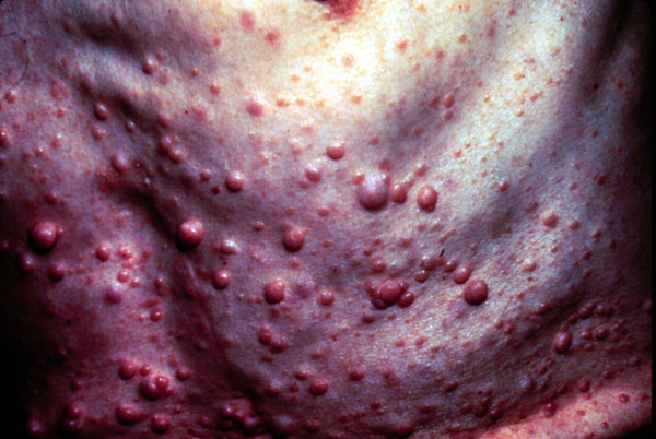 Type I (NFI), von Recklinghausen Disease. Patient has numerous cutaneous and subcutaneous neurofibromas appearing as soft, pedunculated masses.