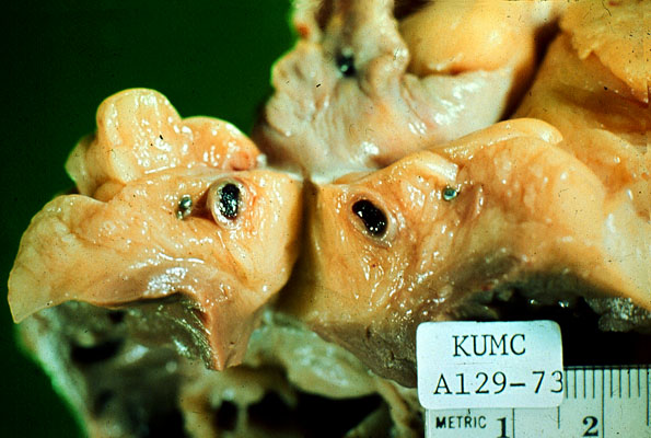 The red-brown thrombus is seen occluding the coronary artery. Thrombosis occurs with injury to the endothelium, for example, when an atherosclerotic plaque ruptures. This can occur at any time, even before the plaque has significantly occluded the coronary. Thrombosis, of course, will cause 100% occlusion, and can occur within a matter of seconds. Thrombosis is definitely linked to the onset of angina, as is often demonstrated in the cardiac catheterization lab.