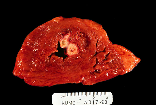 The thrombus is white, and adherent to the ventricular wall. Usually mural thrombi form following myocardial infarct, because the ventricular wall becomes akinetic (motionless), allowing thrombus formation. Portions of the thrombus may break off (embolize), creating infarcts wherever they end up.