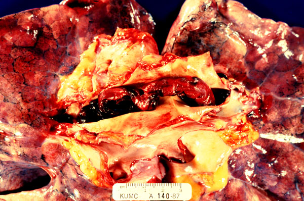 This is a second example of a saddle embolus. The thrombus is usually not adherent to the wall of the artery, and is in the early stages of organization, so it holds together well. Post-mortem clot usually settles out as layers of congealed protein and lipid (so-called "chicken fat"), so it is usually easy to tell the difference.