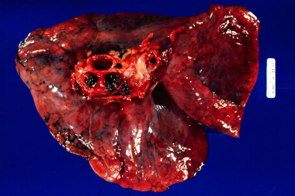 Looking at the hilum, you can see that the large diameter pulmonary artery is nearly occluded by the large thromboembolus.