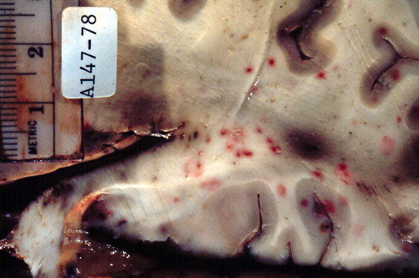 In trauma involving the long bones or the pelvis, a fracture may liberate marrow fat or bone marrow, which enters the circulatory system. Fat emboli entering the venous side end up in the lung, where they can cause the adult respiratory distress syndrome. Fat emboli can also get into the arterial circulation and enter the brain, where they cause petechial hemorrhages and neurologic dysfunction. This is a closer view of the white matter hemorrhages from previous slide.