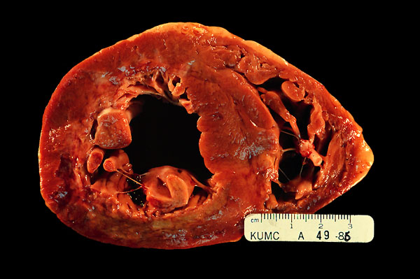 This heart shows the yellow mottling characteristic of a myocardial infarction that is several days old. Macrophages and polymorphonuclear cells have begun to phagocytose dead myocardial cells, accounting for the yellow color.