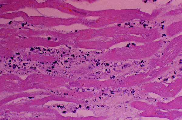 This photomicrograph is from a myocardial infarct that is several days old. Contraction bands are seen, along with macrophages and nuclear debris from polymorphonuclear leukocytes.