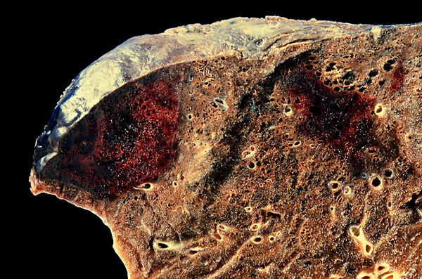Infarcts in the lung are usually due to thromboemboli from the deep veins of the leg. The infarcts are typically wedge-shaped, and extend to the pleural surface. They are called red infarcts, as apposed to the white infarcts seen in spleen and kidney, because the lung has a dual blood supply (pulmonary arteries and bronchial arteries). This dual blood supply means that the intact bronchial arteries can pump blood into the infarcted area, giving it a red appearance.