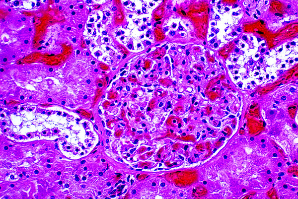 Note the engorged vessels and hyperemic glomeruli. Normally, one sees only a few RBCs in the capilllary loops of the