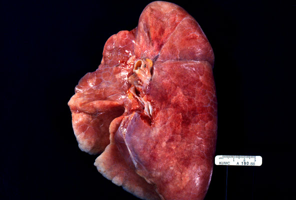 The normal lung at autopsy has a pink color and is well-aerated, whereas a congested lung is red-brown, heavy, and often exhibits pulmonary edema and sub-crepitance (crepitant means you can feel little pockets of air when you squeeze the lung, sub-crepitant means those little pockets are full of fluid).