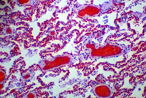 Like the capillaries in the glomerulus, the capillaries in the alveolar septae normally contain RBCs in single file only. In this photomicrograph we can see the congested alveolar septae.