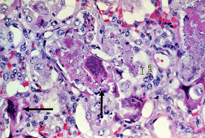 The RSV inclusions appear within the nuclei of the syncytial cells. In situ DNA hybridization can be used to differentiate RSV inclusions from the very similar measles giant cells. Often, the two diseases can be differentiated clinically.Several syncytial cells may be seen in this high power field from of lung tissue (arrows).