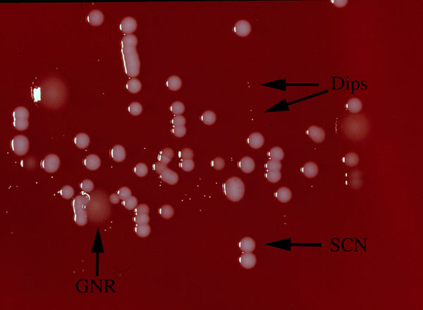 For the microbiologic diagnosis of urinary tract infection, by definition, there must be >100,000 organisms/cc. This definition is used because of the common contamination of a "clean-catch" urine specimen, especially in females. The photograph to the left shows the plate from just such a specimen. It is growing colonies of at least 3 different types (arrows- Gram negative rods (GNR), diptheroids (Dips), and staph coagulase negative (SCN). This culture would be signed out as "mixed flora, probable contamination".Certain patients may have asymptomatic bacteruria, with less than 100,000 organisms/cc. Pregnant women are an example of such a patient population. Any number of organisms may be significant. In such a case, it may be worth considering straight catheterization, to obtain an optimal specimen. However, you must consider the risk that you may introduce organisms by doing a catheterization.