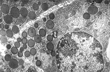 Micro 28. TEM of two adjacent liver cells. Note the darkly-stained lysosomes containing partially digested material.