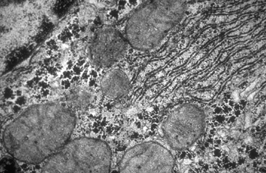 Micro 13. TEM of a liver cell (Erlandsen and Magney, Human Histology: A Microfiche Atlas). This high magnification electron micrograph shows the association of ribosomes with the membranous cisternae that form the RER. Note also the presence of mitochondria and glycogen deposits in this field.