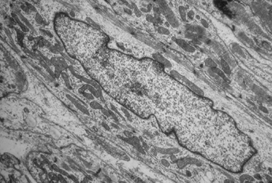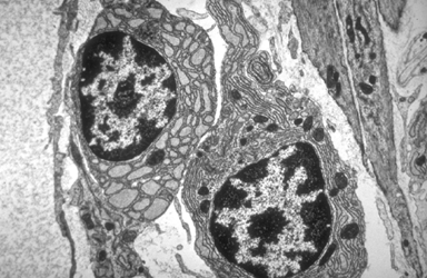 Micro 14. TEM of connective tissue cells (Erlandsen and Magney, Human Histology: A Microfiche Atlas). Note the dilated cisternae of the RER in the cell on the left.