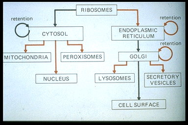 Micro 21. Diagram of synthetic pathways. Note the differing fates of proteins synthesized by free polyribosomes as opposed to ribosomes that are associated with the endoplasmic reticulum.