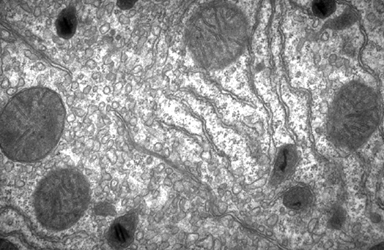 Micro 24. Low magnification TEM (Erlandsen and Magney, Human Histology: A Microfiche Atlas). Mitochondrial morphology varies based on functional state, cell type and, of course, plane of section. Note the round mitochondrial profiles in this electron micrograph.