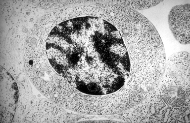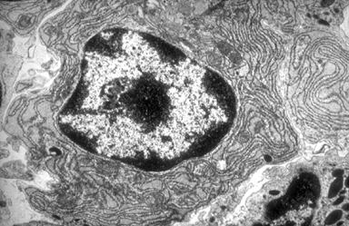 Micro 5. Transmission electron micrograph (TEM) of plasma cell. (Erlandsen and Magney, Human Histology: A Microfiche Atlas). Identify heterochromatin, euchromatin and the nucleolus in this electron micrograph. Note also that the cell shown in this micrograph has abundant rough endoplasmic reticulum.