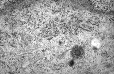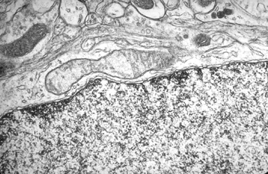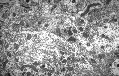 Micro 19. TEM of the CNS. Many free polyribosomes and profiles of RER can be identified in the cell body in the upper right of this electron micrograph.