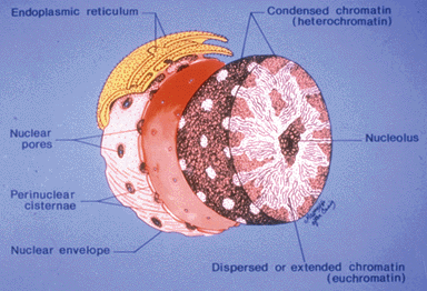 Micro 2. Diagram of the nucleus. (Erlandsen and Magney, Human Histology: A Microfiche Atlas). This diagram shows the major structural features of the nucleus. Note that the nuclear envelope is a double membrane structure with pores.
