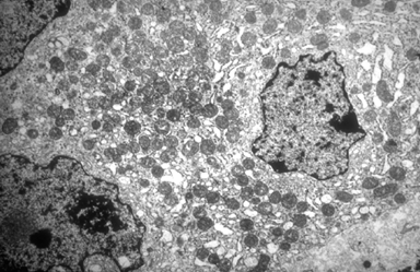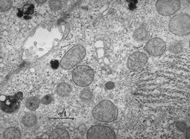 Micro 25. Low magnification TEM (Erlandsen and Magney, Human Histology: A Microfiche Atlas). Note the elongated mitochondria shown in this micrograph.