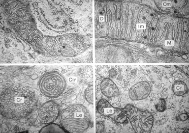 Micro 26. High magnification TEM of mitochondria (Erlandsen and Magney, Human Histology: A Microfiche Atlas). Cristae vary in morphology, as seen in these micrographs of four different cell types. Cr, Cir & Le = cristae in different planes of section; D = dense granule; Im = inner membrane; Om = outer membrane; M = matrix.