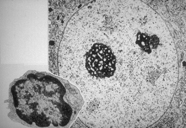 Micro 7. TEMs of two different cell types (Ross and Romrell, Histology, 1989). Note the substructure of the nucleoli evident in the larger micrograph.