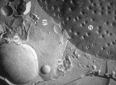 Micro 9. Freeze-fracture of a portion of a cell (Erlandsen and Magney, Human Histology: A Microfiche Atlas). Note the nuclear pores in the nuclear envelope (labelled N). er = endoplasmic reticulum; cm = cytoplasmic matrix.