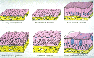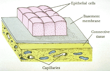 Micro 29. Diagram of general characteristics of epithelia (Ross and Romrell, Histology, 1989). Epithelia are continuous sheets of cells that line cavities or spaces, and form ducts or clusters of cells that form the secretory portions of most glands.