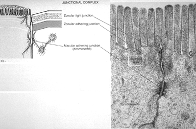 Micro 30. Diagram and TEM of intercellular junctions (Cormack, Introduction to Histology, 1984). Note the characteristic positions of the three principle types of junctions present in epithelial cells.