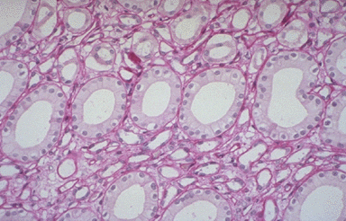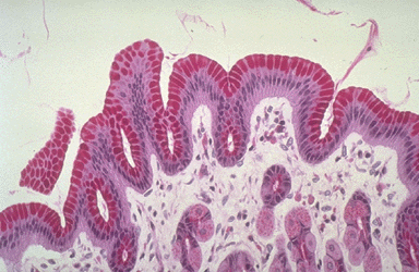 Micro 41. LM of simple columnar epithelium (colon). This example of simple columnar epithelium consists almost completely of secretory cells. In this well preserved preparation the apical cytoplasm is stained red due to the high carbohydrate content of the mucins in the secretory granules.