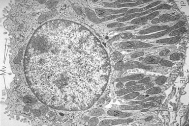 Micro 34. TEM of simple cuboidal epithelium (kidney) (Ross and Romrell, Histology, 1989). Basal specializations can be seen in this electron micrograph (compare with Micro 33). Bl = basal lamina; G = Golgi; Ip = interdigitating processes; M = mitochondria; Mv = microvilli.