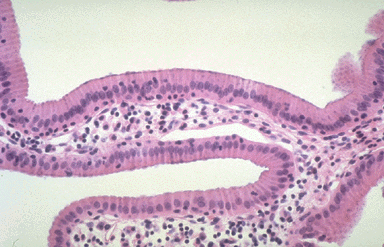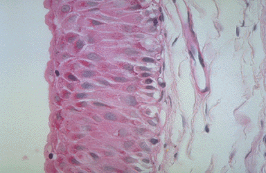 Micro 35. LM of simple columnar epithelium (gallbladder). Note the distinct columnar shape of the cells in this epithelium and the relatively uniform location of the nuclei.