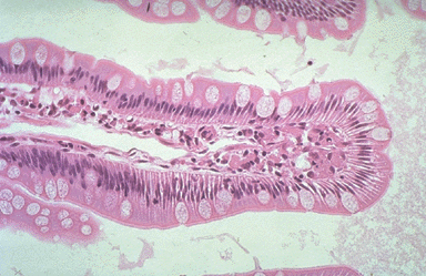 Micro 36. LM of simple columnar epithelium with goblet cells (jejunum). Note that this columnar epithelium (unlike that of the gallbladder) contains mucus-secreting goblet cells (see Micro 37) in addition to absorptive cells that possess numerous apical microvilli (see Micros 38-40). The microvillous border is often termed a striated or brush border.