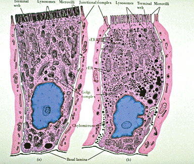 Micro 38. Diagram of absorptive cells (Ross and Romrell, Histology, 1989). Absorptive cells of the gastrointestinal tract are characterized by their microvillous (striated) apical border. The cell on the right is active in fat absorption. Note the polarity of the cells.
