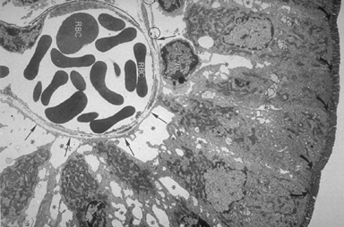 Micro 45. TEM of simple squamous epithelium (lung) (Ross and Romrell, Histology, 1989).