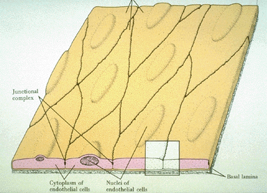 Micro 42. Diagram of simple squamous epithelium (Ross and Romrell, Histology, 1989). Extremely thin, flattened cells make up simple squamous epithelia.