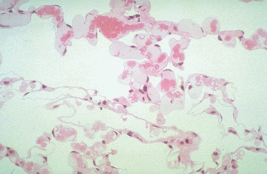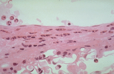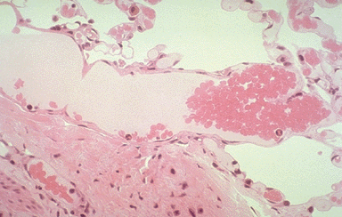 Micro 43. LM of simple squamous epithelium (lung). Nuclei of simple squamous epithelial cells lining the surfaces of lung alveoli and endothelial cells lining blood vessels can be identified in this Micro. Note especially the area just above the large blood vessel in the center of the field.