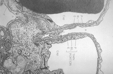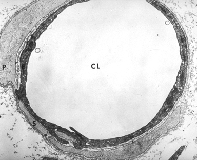 Micro 47. TEM of simple squamous epithelium (endothelium) (Erlandsen and Magney, Human Histology: A Microfiche Atlas). The capillary lumen (cl) is surrounded by a simple squamous cell (E) and its basal lamina. P & S = pericyte and its processes.
