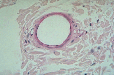Micro 46. LM of simple squamous epithelium (endothelium). Identify the endothelial cells lining the large blood vessel and surrounding capillaries.