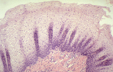 Micro 49. LM of stratified squamous epithelium, nonkeratinized(esophagus). This type of epithelium typically lines wet cavities opening onto the body surface (e.g., mouth, esophagus, anal canal, vagina.